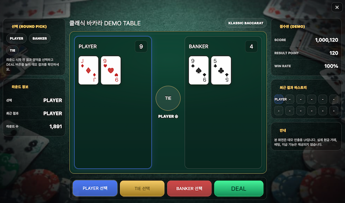 카드 오픈 애니메이션, 라운드 결과 표시, 최근 결과 히스토리 및 점수판(DEMO) UI를 통해 전체 진행 흐름을 쉽게 파악할 수 있어 초보자도 부담 없이 데모 플레이를 즐길 수 있습니다.